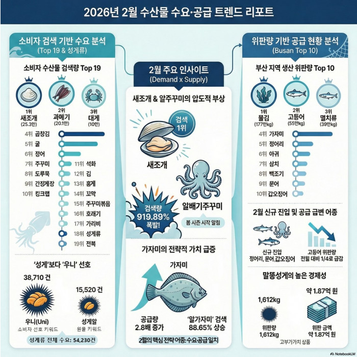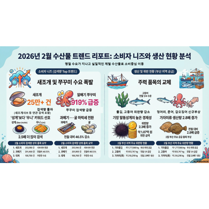 ☞ "2026년 2월 수산물 시장은 겨울 어종의 퇴장과 봄 어종의 조기 진입으로 봄 제철 수요가 본격화되는 전환기의 시장입니다"