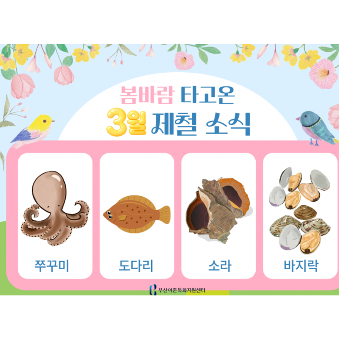 제철을 맞이한 3월의 수산물은 바로바로 쭈꾸미, 도다리, 소라, 바지락 입니다!